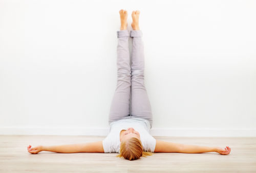 벽과 약간 떨어진 위치에 누워서 다리를 벽에 올리세요. 팔은 양옆으로 벌리고, 무릎이 완전히 펴질 수 있도록 위치를 조정합니다. 그리고 발 사이가 떨어지지 않도록 유지하고, 심호흡을 하면서 1분 동안 운동하면 되는데요. 눈을 감고 명상을 하면서 진행할 수 있습니다.