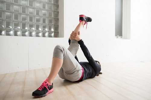 매트에 등을 대고 누운 상태에서 왼쪽 다리를 들고, 무릎을 구부려서 가슴 방향으로 당겨줍니다. 그리고 양손으로 정강이 부분을 잡고, 호흡을 내뱉으면서 눌러줍니다. 30초 운동 후, 반대편 다리를 당겨서 손으로 누르면서 30초 운동하세요.
