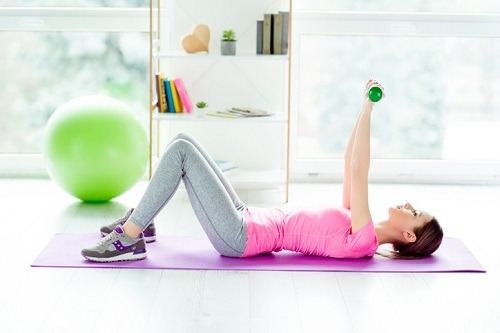 매트에 등을 대고 누운 상태에서 손에 아령을 듭니다. 그리고 무릎을 당기고, 발을 매트에 붙이세요. 그런 다음 팔을 공중으로 들고, 상체를 일으켰다가 내리는 크런치 자세를 진행하세요. 1분 동안 반복하며, 팔이 떨어지지 않도록 주의합니다.