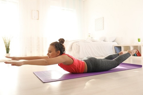 매트에 배를 대고 엎드린 상태로 시작하세요. 그리고 다리를 들고, 무릎을 구부립니다. 발바닥이 천장을 향하도록 하고, 상체를 일으키면서 팔을 뒤로 뻗어주세요. 그런 다음 손으로 발가락이나 발목을 잡아주세요. 척추를 늘이면서 1분간 운동하세요.