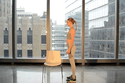 의자 앞에 서서 시작하세요. 그리고 왼쪽 다리를 의자에 올리고, 오른쪽 무릎을 올려줍니다. 그런 다음 오른쪽 다리를 바닥으로 내리고, 왼쪽 다리를 뒤로 뻗어서 무릎을 구부리면, 런지 자세가 완성됩니다. 다리를 바꿔가면서 1분간 운동하세요.
