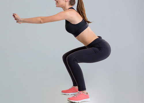 어깨너비로 다리를 벌리고 서서 팔을 앞으로 뻗거나 머리 위로 올립니다. 그리고 무릎을 구부리면서 엉덩이를 내렸다가 올리면 1회가 완료됩니다. 상체는 구부러지지 않도록 펴고, 허벅지가 바닥과 평행하도록 내렸다가 올립니다. 1분간 운동하세요.