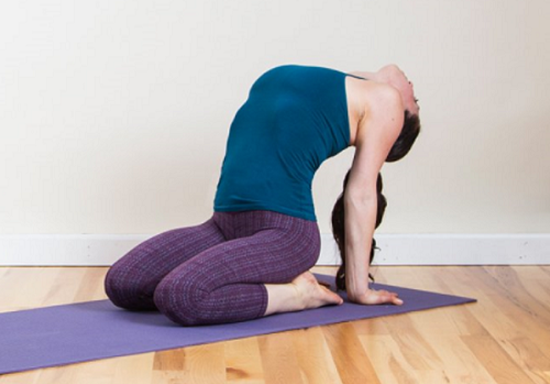 매트에 무릎을 꿇고 앉아서 엉덩이를 발꿈치에 완전히 붙입니다. 그리고 손바닥을 바닥에 붙인 상태로 고개를 뒤로 천천히 젖혀주세요. 팔꿈치를 완전히 펴고, 척추를 최대한 늘여주세요. 1분 동안 낙타 변형 자세를 유지합니다.