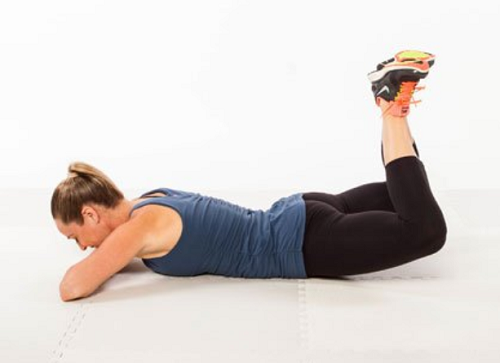 매트에 배를 대고 엎드린 상태에서 팔을 구부려서 턱 밑으로 옮기세요. 그리고 무릎을 구부리고, 다리를 공중으로 올립니다. 발을 붙인 상태를 유지하면서 다리를 들었다가 내리면서 엉덩이에 자극을 줍니다. 1분간 운동하세요.