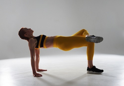 매트에 엉덩이를 대고 앉은 상태에서 손바닥을 대고 밀면서 몸을 띄우고, 리버스 플랭크 자세를 만듭니다. 그리고 오른쪽 다리를 공중으로 뻗고, 자세를 유지하면서 버티세요. 그런 다음 왼쪽 다리를 공중으로 뻗고 버팁니다. 1분간 다리를 바꿔가며 운동하세요.