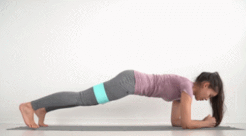 매트에 엎드린 상태에서 팔꿈치를 구부리고, 팔뚝으로 버티는 팔꿈치 플랭크 자세로 전환하세요. 그리고 허벅지에 밴드를 끼워서 운동 강도를 높입니다. 왼쪽 다리를 공중으로 올렸다가 내리면서 오른쪽 다리를 올리면 1회가 완료됩니다. 1분간 다리를 교차하세요.
