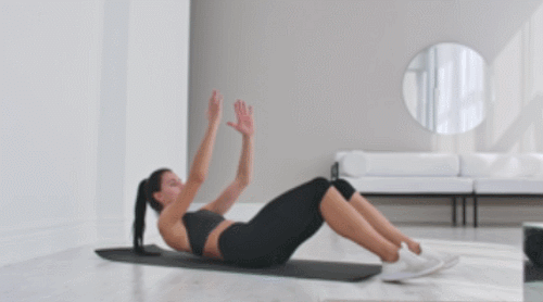 매트에 누워서 무릎을 세우고 발을 붙이세요. 그리고 팔을 머리 위로 올립니다. 그런 다음 상체를 천천히 일으켜 세우면서 앉았다가 천천히 원래 자세로 돌아갑니다. 척추가 꺾이지 않도록 주의하고, 자신의 근력 상태에 맞게 범위를 조절하세요. 1분간 반복합니다.