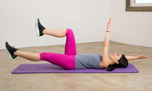 매트에 누워서 다리를 공중으로 들고, 무릎을 90도 각도로 구부립니다. 그리고 팔을 머리 위로 올리세요. 그런 다음 왼팔을 천장으로 뻗는 동시에 왼쪽 다리를 앞으로 뻗습니다. 팔과 다리를 교차하면서 1분 동안 반복하세요.