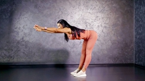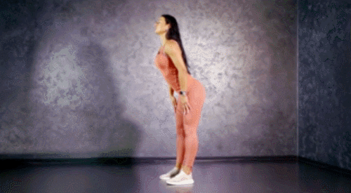 바닥에 다리를 어깨너비로 벌리고 서서 시작하세요. 그리고 상체를 앞으로 숙이면서 손끝을 뻗어주면 되는데요. 몸이 전체적으로 ㄱ자 모양이 되도록 만듭니다. 이때 무릎이 구부러지지 않도록 다리를 완전히 펴주세요. 자세를 유지하며 호흡하고, 최대한 버틴 후, 원래 자세로 돌아옵니다. 1분간 반복하세요.