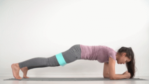 매트에 팔뚝으로 엎드리는 팔꿈치 플랭크 자세로 시작합니다. 그리고 허벅지에 탄력 밴드를 끼우고, 왼쪽 다리를 공중으로 들었다가 내리면서 오른쪽 다리를 들어주는 동작으로 연결하세요. 시선은 바닥을 향하고, 1분간 반복합니다.