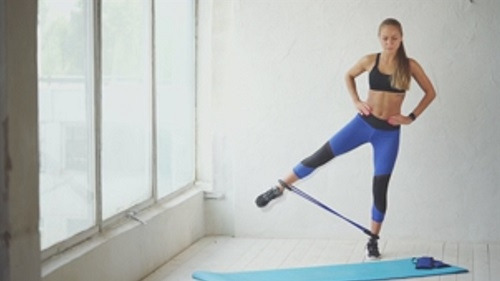 바닥에 서서 탄력 밴드를 종아리나 발목에 끼웁니다. 그리고 손은 옆구리에 가져가고, 오른쪽 다리를 오른쪽 방향으로 들었다가 내리는 사이드 동작을 30초 진행하세요. 이번에는 반대편 다리로 30초 반복하면 되는데요. 자세가 흐트러지지 않도록 균형을 유지해야 합니다.