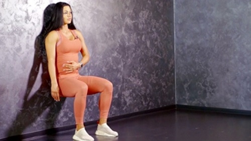 벽에 상체를 기댄 상태에서 다리를 엉덩이 넓이로 벌리고 시작하세요. 무릎을 구부리고, 허벅지를 바닥과 평행한 높이까지 낮춥니다. 자세를 유지하며 최대한 버티세요. 1분 동안 반복하고, 시선은 정면을 향하며, 호흡을 유지합니다.