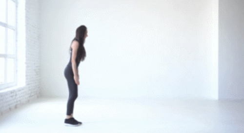 다리를 어깨너비보다 조금 넓게 벌리고 서서 팔은 가슴 앞으로 모아줍니다. 그리고 무릎을 구부리면서 엉덩이를 낮추고, 허벅지가 바닥과 평행한 위치까지 내려오세요. 원래 자세로 돌아가면 1회가 완료됩니다. 1분간 스쿼트 동작을 반복합니다.