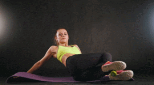 매트에 엉덩이를 대고 앉아서 팔을 옆으로 벌리고 손바닥으로 바닥을 지탱합니다. 그리고 상체를 뒤로 기울이면서 다리를 공중으로 들고, 무릎을 구부리세요. 그런 다음 다리를 왼쪽으로 넘겼다가 돌아오고, 오른쪽으로 넘겼다가 돌아옵니다. 1분간 운동하세요.
