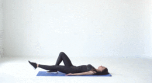 매트에 등을 대고 누워서 다리를 공중으로 듭니다. 그리고 무릎을 구부리고, 다리를 벌려서 최대한 상체 가깝게 붙여주세요. 손으로 발가락을 잡고 당겨줍니다. 호흡을 마셨다가 뱉으면서 하체를 스트레칭합니다. 1분 동안 진행하세요.