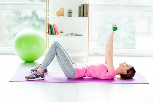 생수병이나 아령을 들고 매트에 누워서 시작합니다. 그리고 무릎을 세우고, 발바닥을 붙이세요. 그런 다음 팔을 공중으로 바닥과 90도 각도가 되도록 들었다가 내려주는 동작을 1분간 반복하면 되는데요. 팔을 올렸을 때 2~3초 정도 멈췄다가 내려주면, 효과를 높일 수 있습니다.