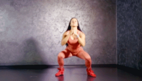 어깨너비보다 더 넓게 다리를 벌리고 서서 시작합니다. 손은 가슴 앞으로 모아주세요. 그리고 무릎을 구부리며, 엉덩이를 낮추고, 스쿼트를 합니다. 그런 다음 일어서면서 살짝 점프하고, 다시 내려오면서 스쿼트를 이어가세요. 1분간 반복합니다.