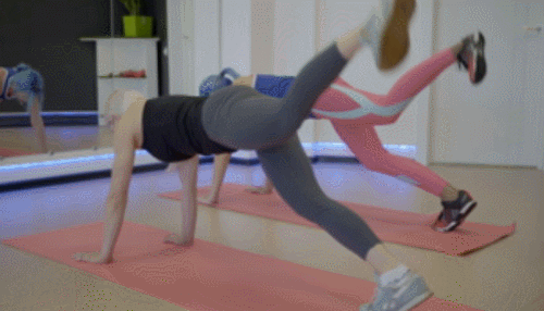 매트에 플랭크 기본자세로 엎드려서 시작합니다. 그리고 왼발을 공중으로 높이 들었다가 내리면서 오른발을 들었다가 내리는 동작으로 연결하세요. 1분 동안 다리를 번갈아 움직입니다. 시선은 바닥을 응시하고, 상체는 움직이지 않도록 고정합니다.