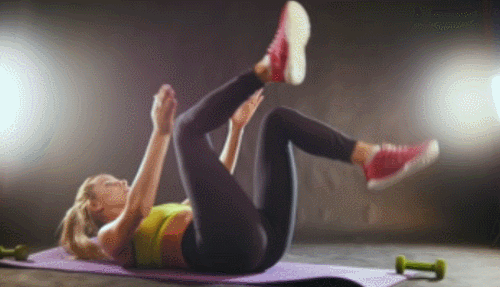 매트에 등을 대고 누운 상태에서 다리를 들고 무릎을 구부리세요. 그리고 왼쪽 다리를 당기면서 상체를 일으키고, 다리 사이의 공간에 양손을 넣어 손바닥을 마주칩니다. 그런 다음 반대편 다리를 당기면서 동일하게 반복하세요. 1분간 운동합니다.