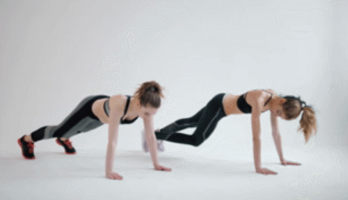 바닥에 플랭크 기본자세로 엎드린 상태에서 오른쪽 무릎을 왼쪽 팔꿈치 방향으로 당겼다가 되돌리고, 왼쪽 무릎을 오른쪽 팔꿈치 방향으로 당겼다가 원위치합니다. 속도를 조절하면서 운동 효과를 높일 수 있는데요. 1분간 다리를 교차합니다.