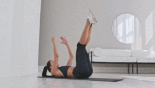 매트에 누워서 손을 머리 옆으로 옮기세요. 그리고 다리를 들고 무릎을 90도 각도로 구부립니다. 그런 다음 왼쪽 발목 위로 오른쪽 발목을 교차합니다. 복부를 중심으로 상체와 하체를 당겼다가 펴주는 동작을 1분간 반복하세요.