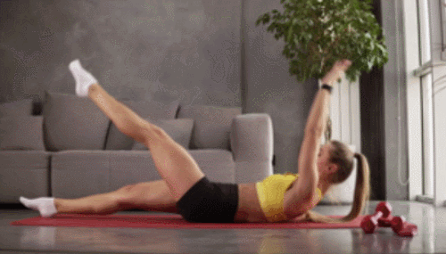 매트에 누워서 몸을 곧게 펴주세요. 손은 머리 위로 올립니다. 그리고 복부를 중심으로 왼쪽 다리를 천장으로 들어주면서 상체를 일으키고, 손을 당겨서 뻗어주세요. 원래 자세로 돌아가면, 오른쪽 다리를 올리는 동작과 함께 상체를 일으켜 손을 뻗어줍니다. 1분간 다리를 바꿔가며 운동합니다.