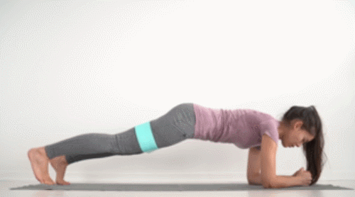 매트에 팔뚝을 대고 엎드려서 팔꿈치 플랭크 자세를 만듭니다. 허벅지 사이에 탄력 밴드를 끼우면 운동 효과를 높일 수 있는데요. 왼쪽 다리를 공중으로 들었다가 내리고, 오른쪽 다리로 반복하면 1회가 완료됩니다. 시선은 바닥을 향하고, 1분간 운동하세요.