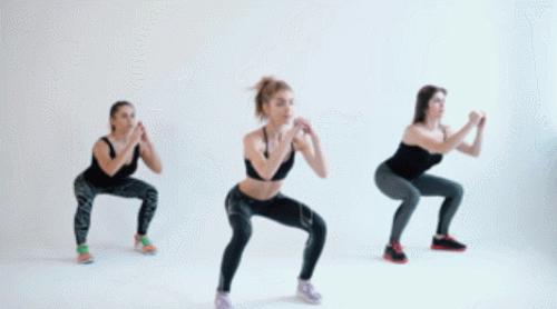 매트에 다리를 모으고 선 상태에서 손을 머리 위로 올리세요. 그리고 무릎을 구부리면서 엉덩이를 낮추세요. 시선은 정면을 응시하고, 복부에 긴장감을 유지하면서 1분 동안 버팁니다. 상체가 구부정하지 않도록 신경 써서 진행하세요.