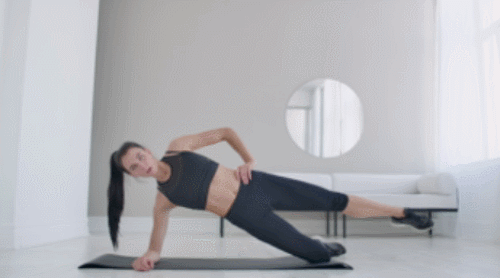 매트에 오른쪽 팔뚝을 대고 옆으로 누워서 시작하세요. 왼손은 옆구리에 가져갑니다. 그리고 왼발을 공중으로 천천히 들었다가 내리는 동작을 30초 반복하세요. 반대편으로 돌아서 눕고, 오른발을 들었다가 내리면서 30초 진행합니다.