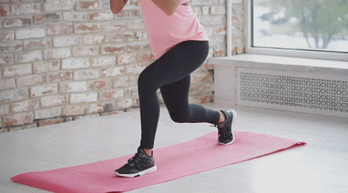 다리를 모으고 서서 왼쪽 다리를 앞으로 내딛고, 무릎을 90도 각도로 구부리면서 런지 동작을 진행합니다. 손은 가슴 앞에서 잡고, 상체는 구부러지지 않게 세웁니다. 시선은 정면을 응시하세요. 30초 반복 후, 반대편 다리를 앞으로 내딛고, 30초 운동하세요. 100개를 목표로 나눠서 운동합니다.