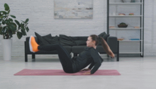 매트에 앉아서 다리를 펴고, 손바닥으로 바닥을 지탱합니다. 그리고 다리를 공중으로 들어줍니다. 그런 다음 복부를 중심으로 다리를 당기는 동시에 상체를 일으키세요. 무릎은 구부리고, 팔꿈치를 펴줍니다. 1분간 반복하세요.