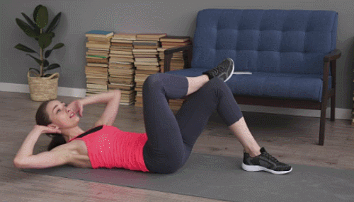매트에 누워서 무릎을 세우고, 발을 바닥에 고정하세요. 그리고 손을 머리 옆으로 옮기거나 뒤로 이동하여 깍지 껴 잡습니다. 그런 다음 오른발을 왼쪽 허벅지 위에 올립니다. 상체를 오른쪽으로 일으키면서 왼쪽 팔꿈치를 오른쪽 무릎 방향으로 가져가세요. 30초 반복 후, 다리의 위치를 바꿔서 상체를 일으키는 운동을 30초 운동합니다.
