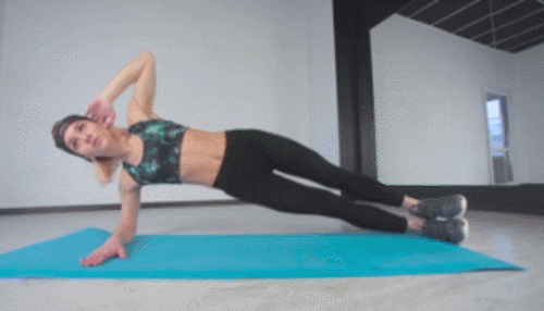 오른쪽 팔뚝을 대고 옆으로 눕고, 왼손은 머리 옆으로 옮깁니다. 그리고 엉덩이를 들어서 사이드 플랭크 자세를 만듭니다. 그런 다음 업다운 동작을 30초 동안 반복하세요. 반대편으로 자세를 바꿔서 동일한 동작을 30초 운동합니다.