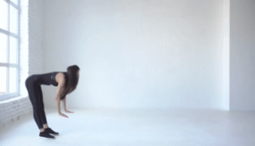 다리를 모으고 서서 시작합니다. 그리고 상체를 숙여서 손바닥을 바닥에 대고, 앞으로 움직이면서 플랭크 자세를 만드세요. 그런 다음 다리를 한 발씩 당기면서 손목까지 이동합니다. 다시 손을 앞으로 움직이면서 이동하면 되는데요. 1분간 반복하세요.