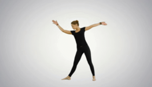 정면을 보고 서서 오른쪽 발목을 오른쪽 방향으로 틀어줍니다. 그리고 양팔을 옆으로 벌리고, 오른쪽 방향으로 상체를 숙이면서 팔을 내립니다. 오른팔로 오른발을 잡고, 왼팔은 천장으로 뻗어주세요. 좌우로 바꿔가며 1분간 운동하세요.