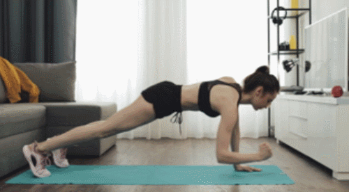 바닥에 어깨너비로 손을 대고 엎드려서 플랭크 기본자세를 만듭니다. 그리고 팔꿈치를 구부려서 팔뚝을 대면, 팔꿈치 플랭크 자세로 전환할 수 있는데요. 다시 팔꿈치를 펴고, 플랭크 자세로 돌아오면, 1회가 완료됩니다. 1분간 계속 진행하세요.