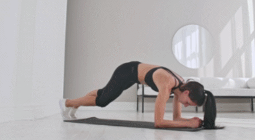 매트 팔뚝을 대고 엎드려서 팔꿈치 플랭크 자세를 만듭니다. 그리고 왼쪽 무릎을 오른쪽 팔꿈치 방향으로 당겼다가 원위치하세요. 이번에는 오른쪽 무릎을 왼쪽 팔꿈치 방향으로 당기는 동작을 진행합니다. 시선은 바닥을 향하고, 1분간 운동하세요.