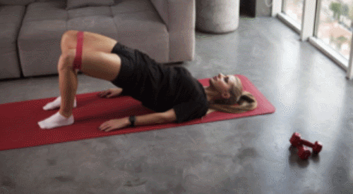 매트에 누워서 허벅지 사이에 탄력 밴드를 끼웁니다. 그리고 무릎을 세우고, 엉덩이를 들어서 브릿지 자세를 만듭니다. 그런 다음 다리를 벌렸다가 오므리면서 엉덩이를 매트에 붙이세요. 이러한 동작을 1분간 반복합니다.