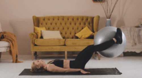 매트에 누워서 다리 사이에 짐볼을 끼웁니다. 그리고 상체는 안정적으로 고정하고, 다리를 천천히 들었다가 내리는 레그레이즈 동작을 진행하면 되는데요. 허리가 뜨지 않도록 주의하고, 복부에 힘을 주면서 1분간 운동합니다.