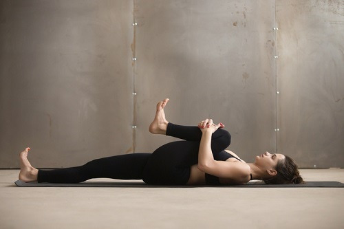 매트에 등을 대고 눕고, 전신을 편하게 만드세요. 그리고 왼쪽 다리를 공중으로 들면서 무릎을 구부리고, 상체에 최대한 붙이는 동작을 이어가면 되는데요. 양손으로 정강이를 누르면서 스트레칭을 강화합니다. 30초 진행 후, 반대편 다리로 30초 반복하세요.
