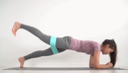 허벅지 사이에 탄력 밴드를 끼우고, 팔뚝을 매트에 대고 엎드리세요. 시선은 바닥을 응시하며, 오른쪽 다리를 들었다가 내리면서 왼쪽 다리를 들어줍니다. 1분 동안 킥 동작을 반복하면 되는데요. 상체가 무너지지 않도록 균형을 유지하세요.