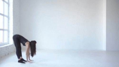 바닥에 선 상태에서 상체를 앞으로 숙입니다. 그리고 손바닥을 바닥에 지탱하고, 앞으로 움직이면서 플랭크 자세를 만드세요. 그런 다음 다리를 손목 방향으로 당기면서 원래 자세로 돌아옵니다. 1분간 플랭크 워크 동작을 반복하세요.