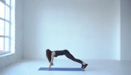 변형 바닥에 서서 시작하며, 오른쪽 다리를 뒤로 드는 동시에 상체를 앞으로 숙입니다. 그리고 손바닥을 바닥에 대고, 앞으로 손을 움직이면서 플랭크 자세로 전환하세요. 다시 손을 발로 당기면서 상체를 일으키세요. 1분간 반복합니다.
