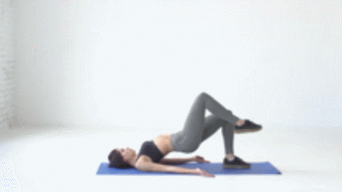 매트에 누워서 브릿지 자세를 만듭니다. 그리고 오른쪽 다리를 공중으로 들어서 무릎을 당겨주는 동작을 진행하세요. 그런 다음 엉덩이를 내리면서 다리를 펴줍니다. 30초 반복 후, 왼쪽 다리를 들었다가 내리는 동작을 30초 반복합니다.