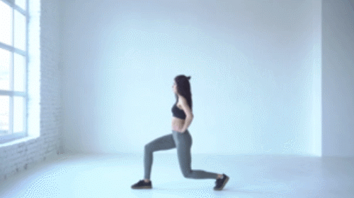 바닥에 서서 손을 옆구리로 옮깁니다. 그리고 오른쪽 다리를 앞으로 내딛고 런지 자세를 만드세요. 무릎을 90도 각도로 구부리면서 엉덩이를 낮췄다가 일으키며, 30초 운동하세요. 반대편 다리를 앞으로 내딛고, 30초 반복합니다. 시선은 정면을 보고, 상체는 꼿꼿하게 세우세요.