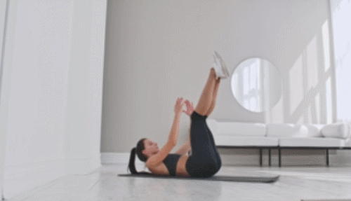 매트에 눕고, 다리를 공중으로 띄웁니다. 바닥과 90도 각도를 유지하고, 무릎을 최대한 펴주세요. 그리고 상체를 일으켰다가 내리는 크런치 동작을 1분간 반복하면 되는데요. 팔을 앞으로 뻗어주고, 복부 전체를 압박합니다.