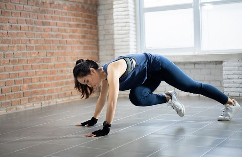 매트에 엎드려서 플랭크 자세를 만듭니다. 그리고 왼쪽 무릎을 오른쪽 팔꿈치로 당기는 크로스 니업 동작을 진행하세요. 이번에는 오른쪽 무릎을 왼쪽 팔꿈치 방향으로 당겨주세요. 상체는 안정적으로 고정한 상태에서 다리를 1분간 교차합니다.