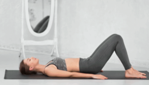 매트에 눕고 무릎을 구부리며 발을 붙이세요. 그리고 팔을 뻗어서 바닥으로 밀면서 엉덩이를 들어줍니다. 브릿지 자세를 만들면 되는데요. 엉덩이를 내리면서 원래 자세로 돌아옵니다. 엉덩이를 들었다가 내리면서 1분간 운동하세요.