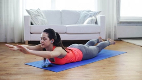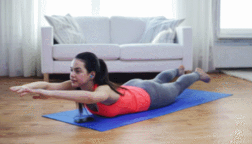 매트에 배를 대고 엎드린 상태에서 팔을 머리 위로 뻗어줍니다. 그리고 상체와 하체를 동시에 들어주면서 슈퍼맨 자세를 만듭니다. 이 자세를 유지하며 최대한 버텼다가 원래 자세로 돌아오세요. 1분 동안 슈퍼맨 자세를 반복하여 진행합니다.