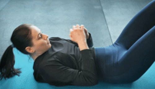 매트에 등을 대고 누운 상태에서 무릎을 구부리고 발을 붙입니다. 그리고 손은 가슴 앞으로 모아주세요. 그런 다음 상체를 일으켰다가 내리는 크런치 동작을 1분 동안 진행하면 되는데요. 복부에 힘을 준 상태를 유지하면서 운동합니다.